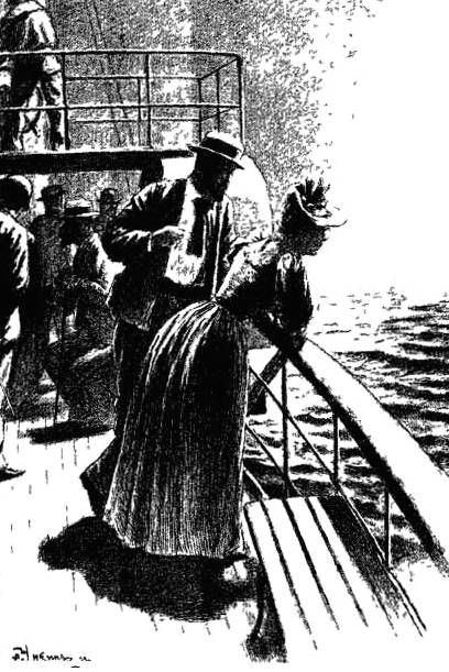 Они стояли у самыхъ перилъ. Она, облокотясь на нихъ, смотрѣла на бѣлоснѣжную пѣну, бившую изъ подъ колесъ, на подвижные узоры тончайшаго серебрянаго кружева, разстилавшагося далеко за ними. Онъ смотрѣлъ только на нее, на ея нѣжный профиль, озаренный луною, и воодушевлялся все горячѣй. Не слыша отвѣта онъ повторилъ: