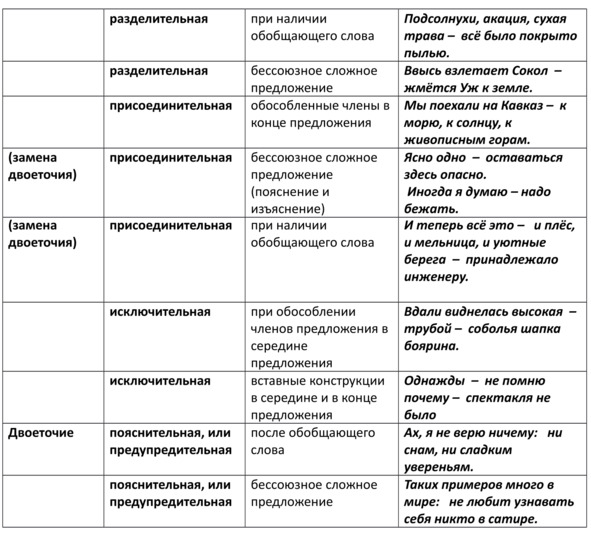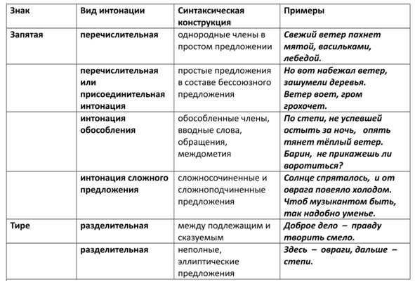 В приведенной ниже обобщенной таблице показано соответствие между видом синтаксических конструкций, интонацией и используемыми знаками препинания.