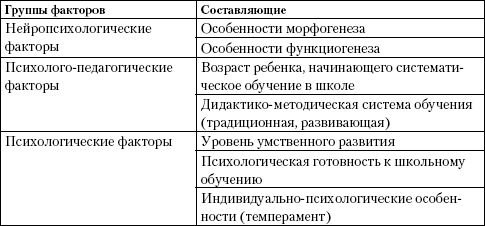 Школьная неуспеваемость, как уже отмечалось, поликаузальна по своей природе и возникает в результате действия различных факторов. Ниже мы рассмотрим три группы факторов, неучет специфического влияния которых на процесс обучения негативно сказывается на его качестве. В табл. 1 приведены три группы факторов, влияющих на школьную успеваемость, – нейропсихологические, психолого–педагогические и психологические и их составляющие.