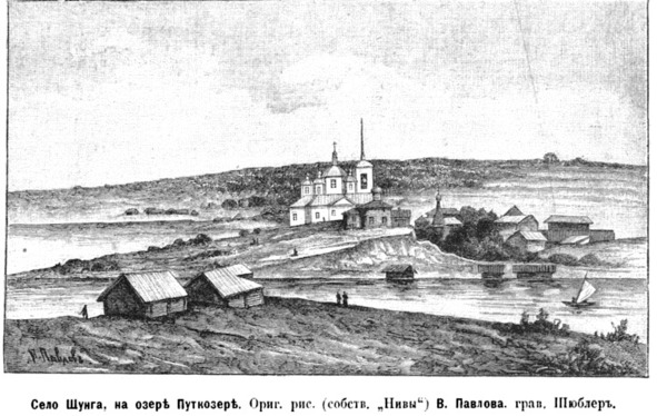 Шунгской, погостЪ Олонецкаго НамЪстничества вЪ ПовЪнецкомЪ уЪздЪ. ВЪ ономЪ бываютЪ вЪ году двЪ ярмарки: первая Генваря 6, вторая Марта 25, на кои приезжаютЪ купцы сЪ шелковыми, бумажными, гарусными и прочими товарами.