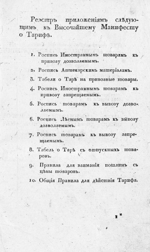 31 марта 1816 года император Александр I издает «Манифест о разрешении привоза разных иностранных товаров». В нем содержится реестр товаров «к вывозу и привозу дозволяемых/ запрещаемых» и правила взимания пошлин.