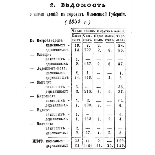 «Ведомость о числе зданий в городах Олонецкой губернии» (1854 год)