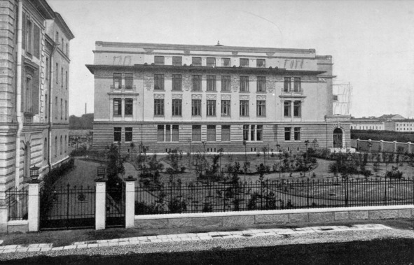 Возведение в 1912 году, по проекту финских архитекторов, нового здания хирургической факультетской клиники для этого старого, открытого еще в 1835 году медицинского учреждения, было спонсировано выпускницей Женских медицинских курсов г-жой Нобель-Олейниковой (о чем гласит недавно появившаяся на фасаде мемориальная табличка под бронзу). Показательное целесообразностью планировки и гигиены четырехэтажное здание оживлялось, помимо высоких окон, открытыми на юго-восток лоджиями-соляриями средних этажей и застекленным пролетом парадной лестницы. Полированные перила внизу заканчивались резным столбом с львиной мордой (столб этот, переживший тяготы революции и блокады, все-таки исчез во время ремонта на переломе веков). На север, во двор, выходили «черная» дверь и стеклянный амфитеатр операционной. В подвальном этаже размещалась котельная, питавшая клинику водой и теплом. Отдельный трехэтажный «флигель» во дворе (сейчас – институтский архив) заселял подсобный персонал.