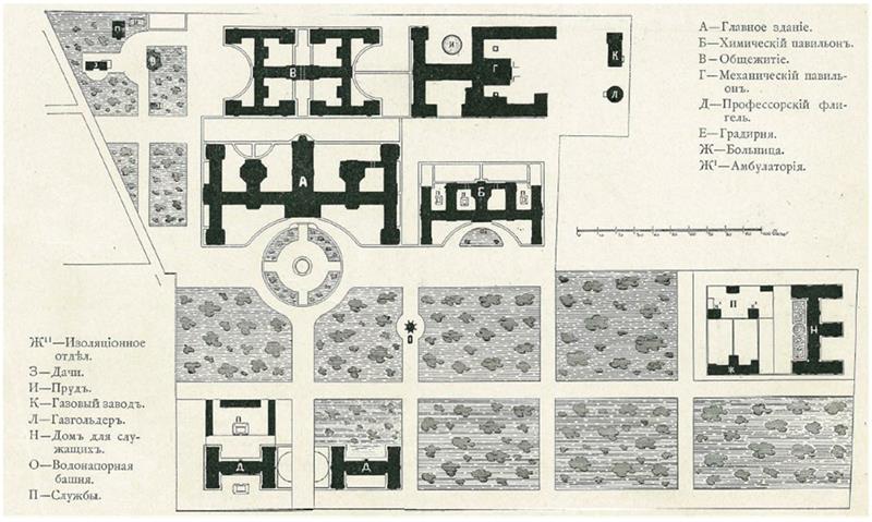 Строительство Политехнического института Петра Великого производилось поэтапно, начиная с 1899 г., с учетом первоочередного ввода в работу главного здания, химического павильона, 1-го и 2-го студенческих общежитий, профессорского дома, зданий машинного зала, котельной, газового завода. К осени 1902 г. инженерные системы основных зданий института начали функционировать. В дальнейшем выполнялось строительство механического павильона, водонапорной башни с гидравлической лабораторией, служительского дома, 3-го студенческого общежития, больницы и других вспомогательных зданий. Генеральный план Политехнического института в 1902 г. выглядел следующим образом, рис. 1. При строительстве этот план претерпел некоторые изменения.