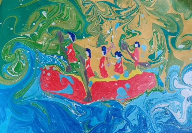 И вдруг туристы начинают повторять за ней. Становится весело. У народа уже выходят красивые такие отпечатки ладоней и каракули, похожие на наскальную живопись.