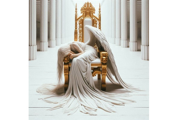 В самом центре зала стояло высокое кресло и в нем, положив голову на скрещенные на одном из подлокотников руки, спал белый Ангел. Изгиб его тела был прекрасен, длинные белые волосы полностью закрывали лицо, падали вниз, почти до пола, и перемешивались со складками великолепного платья. Перышки двух его крыльев, казалось, тоже спали, неподвижно лежали на спине, умиротворенно и расслабленно.