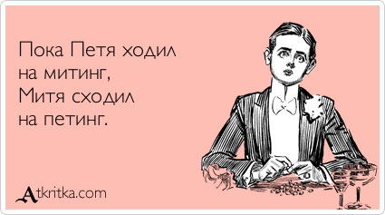 – Петя идет на митинг, а Митя идет на петтинг, а Мила идет на мыло ей петтинга не хватило…[8]