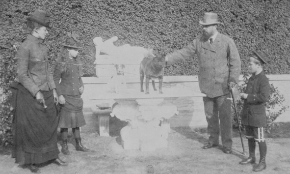 Александр III гладит собаку, Михаил и Ксения наблюдают. 1888 год