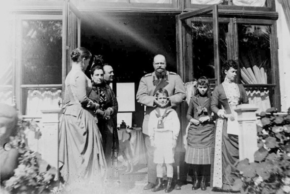 Александр III с супругой Марией Федоровной и детьми. Слева направо: Михаил, Николай, Ольга (отец ее обнимает), Ксения, Георгий. 1889 год