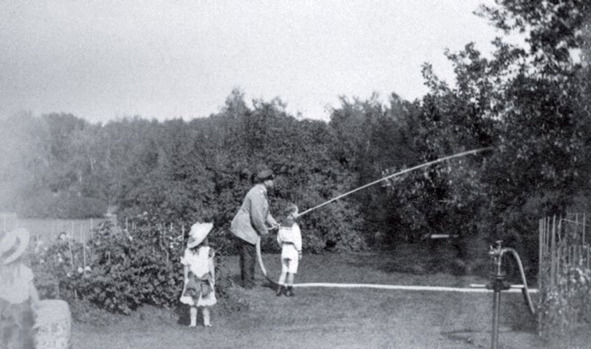 Александр III поливает деревья из шланга, рядом сын Михаил и дочь Ольга. 1888 год