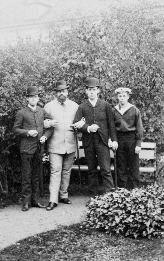 Александр III с сыновьями Николаем (слева) и Георгием (крайний справа). Между императором и великим князем стоит принц Константин Греческий. Дания, 1888 год