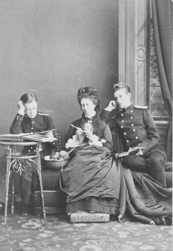 Мария Александровна за вязанием. Справа сын Алексей, слева сын Сергей. 1870 год