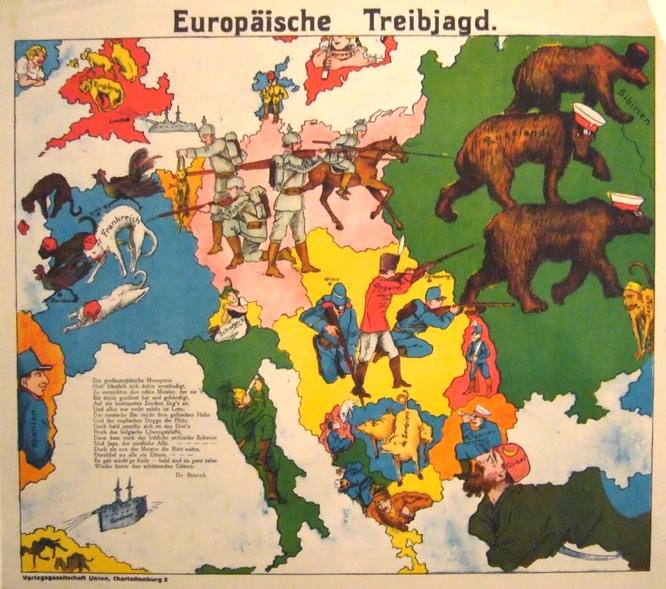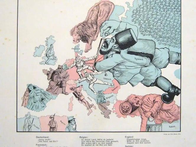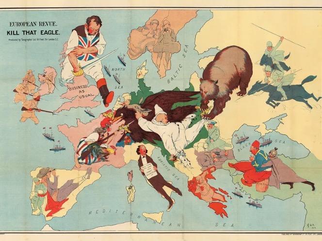 Великолепная карта, показывающая уверенность, которую многие испытывали в начале Первой мировой войны: иллюстратор был убежден, что объединенная мощь России, Франции и Британской империи быстро разгромит Германию и ее «шутовского» союзника, Австро-Венгерскую империю.