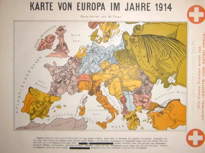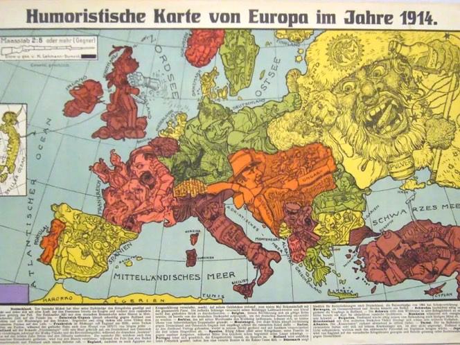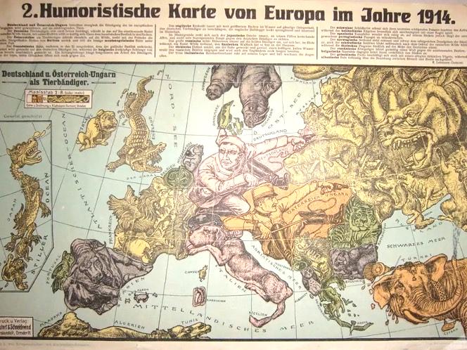 Первая из двух карт Карла Лемана-Дюмона, опубликованных в Дрездене в 1914 году под названием «Юмористическая карта Европы 1914 года».