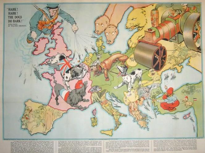 Это британская карта 1914 года, на которой начало войны изображено как схватка между собаками: французским пуделем, британским бульдогом, немецкой таксой и австро-венгерской дворнягой. Британский моряк возвышается над картой, мощь Королевского флота натянута на поводке.