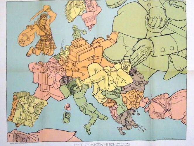 Эта голландская карта была опубликована в 1915 году, после вступления Италии в войну. Фигура, изображающая нейтральную Голландию, смотрит через плечо на своего воинственного соседа. Под давлением Германии художник был отдан под суд за нарушение нейтралитета Нидерландов, а за его голову немцы позже назначили цену в 12 000 гульденов.
