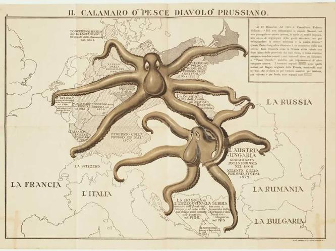 Очень скудная пропагандистская карта, на которой осьминоги-близнецы – Пруссия и Австро-Венгерская империя – протягивают свои щупальца по Центральной Европе.