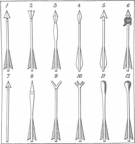 1, 2, 3, 4, 5, 6, 7 – военные стрелы; 6 – стрела с бечевой, смоченной в масле для поджигания кораблей и домов; 7 – стрела для легкого арбалета; 8 – стрела для охоты на оленей; 9, 10 – стрелы для охоты на крупных птиц; 11, 12 – стрелы для охоты на пернатую дичь. Последние не имели металлических наконечников и были затуплены, чтобы не испортить дичь.