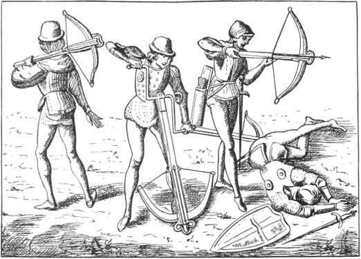 Фигура в центре, как видно, натягивает арбалет лебедкой, а нога поставлена на дугу оружия.