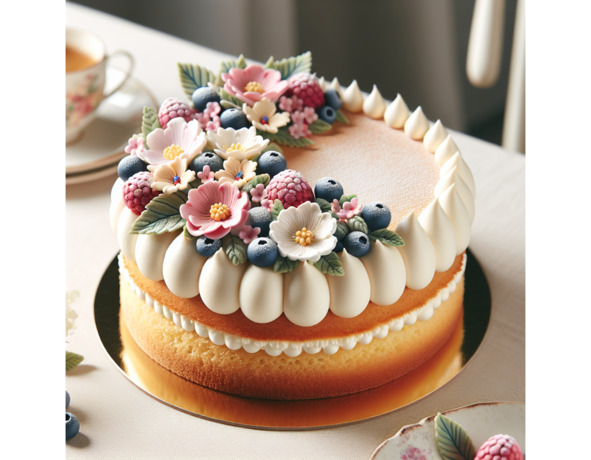 Оформлен бисквитный тортКремом из белкового безе.Цветочно-ягодный натюрмортНа слоях воздушного суфле.