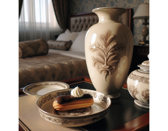 Супер номер предоставил отель —Всё вокруг из костяного фарфора.Эклер на блюде с росписью гжель,Молочная ваза – элемент декора.