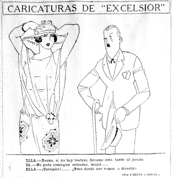 FIGURA 1. Boletos para el jurado. Excélsior, 29 de abril de 1928, p. 6. “ELLA: Bueno, si no hay teatros, llévame esta tarde al jurado. / ÉL: No pude conseguir entradas, mujer… / ELLA: ¡Caramba!… ¿Pues dónde nos vamos a divertir?”