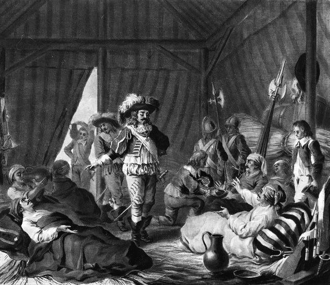 Несмотря на кажущуюся предсказуемость, Сержан тщательно работал над портретами последних – офицеров армии и флота, чтобы передать важные послания о меняющемся облике войны, воинов и героизма. Сержан следил, чтобы акцент этих портретов был не на торжестве храбрости и стойкости в бою. Он восхвалял военных героев за другие, более гуманные и человеческие поступки как на поле боя, так и за его пределами. Художник прославлял Жан-Шарля, шевалье де Фолара (1669–1752), не только за его службу в армии Людовика XIV, но и за роль военного мыслителя и учителя. Сержан решил изобразить де Фолара сидящим за столом и обучающим маршала Морица Саксонского, главного генерала Франции во время Войны за австрийское наследство, принципам войны. Сержан превозносил шевалье Баярда (1473–1524) за его сдержанность по отношению к заключенной, над которой он сжалился и избавил от ожидаемого изнасилования или смерти. Схожим образом его гравюра графа д’Аркур (1601–1666), известного по прозвищу cadet à la perle (жемчужный кадет), отражает действия графа после победоносной осады Турина (1640), когда он проигнорировал жесткие условия капитуляции и принес вино и продовольствие больным и голодным итальянским жертвам осажденного города. Д’Аркур стал героем, потому что ослушался приказов (рис. 1).