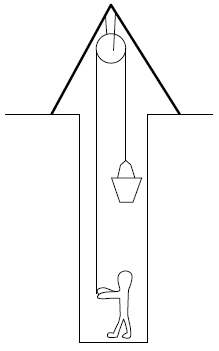 Отец, находясь наверху, нагрузил мне полное ведро бетона и подвесил его на крючок, приделанный к канату. Я начал медленно отпускать перекинутый через строительный блок канат, давая при этом ведру медленно опускаться в колодец. При этом канат, который я таким образом постепенно отпускал тянул меня вверх всей тяжестью спускаемого ведра.