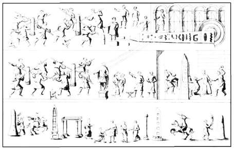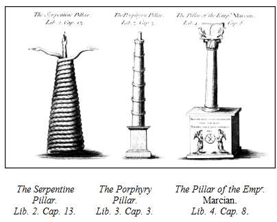 – No Wonder such Celestial Charms,For ten long Years should hold the World in Arms.Pope.Pardon this Digression: – There was also plac’d upon a Pillar a more modern Statue of a Woman, which was very curious and agreeable. Her Hair hung down behind, combed close down from the Forehead backwards, not breaded up, but bending to the Hand of the Spectator. Upon the right Hand of this Statue stood the Equestrian Statue of a Man. The Horse stood upon one Leg, the other bore a Cup with a mix’d Potion. The Rider was of a large Size, his Body compleatly arm’d, his Legs and his Feet were cover’d with Greaves, his Air was manly, rough, and warlike. The Horse was mettlesome, and high courag’d, pricking up his Ears, as tho’ he heard the Trumpet. His Neck was high, his Look fierce, his Eyes sparkling, as eager for the Battle; he rear’d up his Fore-feet, and pranced like a War-Horse. Near this Statue, hard by the Eastern Goal, call’d Rusius, were a Range of Statues of Charioteers, dextrous in driving the Chariot, and turning the Goal. They were very busy in managing their Bridles, and smacking their Whips, and directing their Horses, with their Eyes fix’d steddily upon the Goal. In short, there seem’d to be describ’d in these Figures all the Tumult and Fury of a Chariot Race, with the most vigorous Struggle for Victory and Success. This Description of these Statues may seem imperfect; for it never was my Intention to describe them all. But what gave me the most agreeable Pleasure, and seem’d to me the most admirable Piece of Workmanship, was a large Pedestal, upon which was plac’d an Animal cast in Brass, as large as an Ox, having a short Tail, and a moderate Dewlap, something like the Ægyptian Cattle. It had no Hoofs; but held in its Teeth, ready to strangle it, another Animal, cloth’d all over with Scales, almost impenetrable. It seem’d to be a Basilisk, and had a Mouth somewhat like a Serpent’s. It was taken by many to be an Ox of the Nile, and by some to be a Crocodile. But I forbear to give the several Conjectures upon it. These Figures however seem’d to represent an odd Sort of Fight, each of them furiously striving for Victory. The Creature which seem’d to be the Basilisk was in Colour like a Frog, and was all over bloated from Head to Foot. He was casting out his Venom upon his Antagonist, with an Intent to destroy him. This Animal was carv’d as bearing upon one Knee, and in a languishing Condition. This Observation gave the Spectators occasion to believe it fallen dead backward, if the Base where he stood had not supported him. There was also the Figure of another Animal, in whose Jaws was represented a Smaller Creature, whose Mouth was open as almost choak’d by the Teeth which held him, struggling to get loose, but to no Purpose. His Tail, which was very Short, seem’d to tremble; his Shoulders, his fore Feet, and the hinder Part of his Body, were hid in the Mouth of his Enemy, and mash’d by his Jaws. These Animals also mutually kill’d each other. Thus we may observe, that these Poisonous Creatures, so destructive to Man, are no less noxious to each other. And this, many Times, is the Case of Nations, and Kingdoms, as was exemplify’d in the Romans, when they made War upon us; killing, and destroying one another, through the Power of Christ, who rejoyceth not in Blood, and disperseth the Nations that delight in War; who maketh the Just to walk upon the Adder, and the Basilisk, and treadeth the Lyon and Dragon under his Feet.