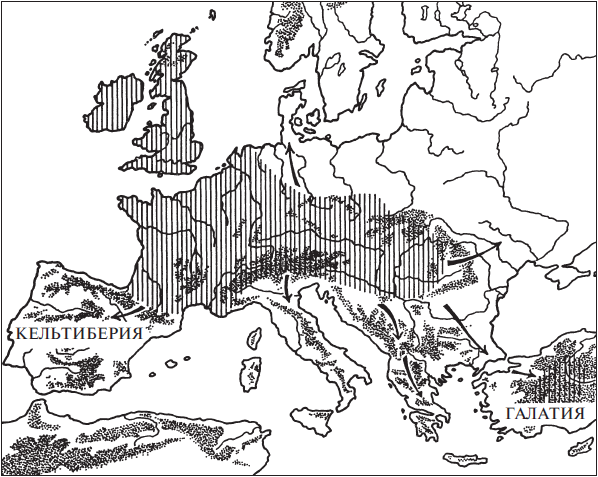 Распространение кельтской культуры демонстрируют нам археология, комментарии греческих и римских географов, а также кельтские названия мест, подтвержденные надписями, или упоминаниями у классических писателей, или же дошедшими до нас в постклассической форме. Как вскоре мы увидим, материальная культура, которую археология классифицирует как средний или поздний латенский период, демонстрирует поразительную схожесть типов оружия и орудий труда, фортификационной техники, стилей убранства и украшений, погребальных обычаев. И все это на удивительно больших пространствах Европы. Из описаний классиков нам известны не только места поселения больших групп различных племен, но также сведения о миграции кельтов, начиная с их рейдов в Италию на пороге IV века до н. э. Кельтские разбойничьи шайки появлялись в Балканах, доходили до Дельф и в конце концов в 279–278 годах до н. э. основали поселения галатов в Малой Азии. Кельтские наемники служили в греческих войсках на Сицилии (368 г. до н. э.) и в Египте (274 г. до н. э.). Названия местностей, где располагались центральные поселения племен, рек и холмов, подтверждают археологические свидетельства и намекают на разные этапы переселения народов. Так, названия, в которых есть элемент «-брига», связаны с Иберией, но не с Британскими островами, которые делят с континентальной Европой употребление частиц «-магус» и «-дунум».