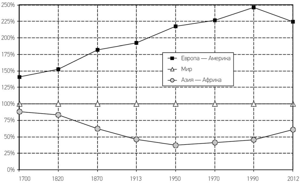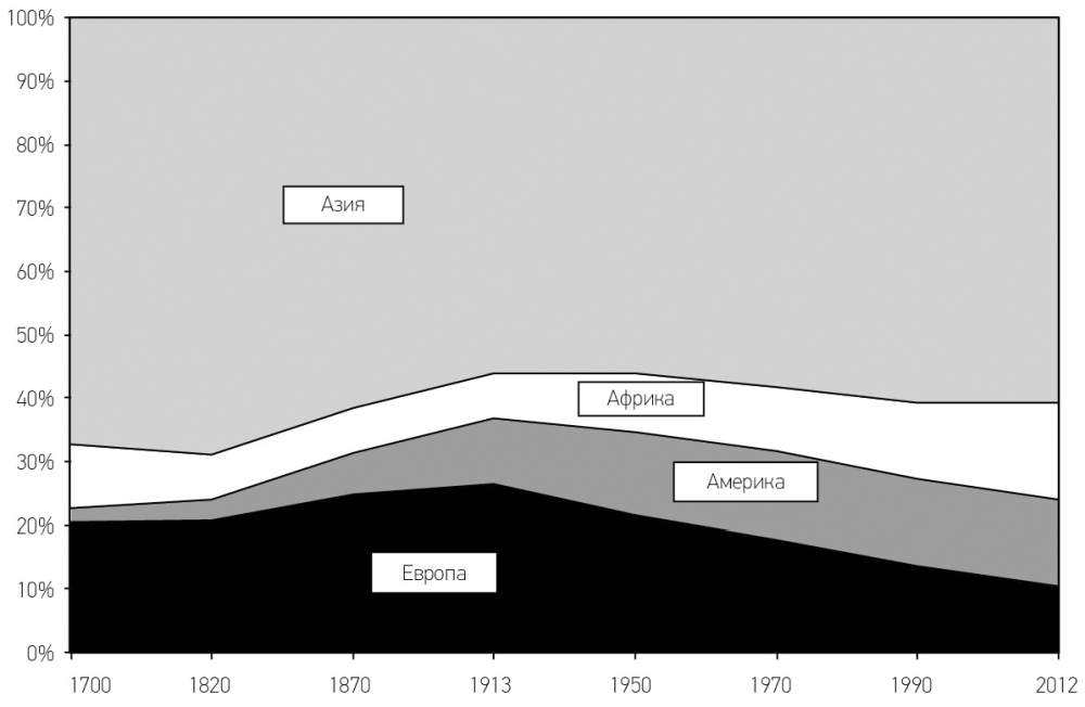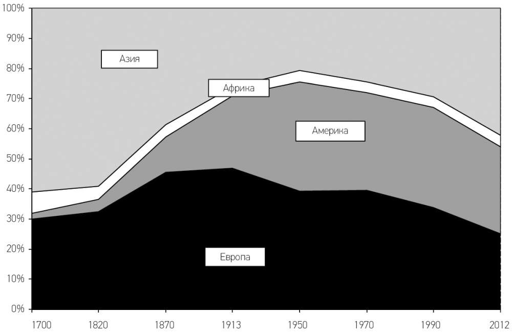 Между 1900 и 1980 годами от 70 до 80 % мирового производства товаров и услуг приходилось на Европу и Америку, что отражало их экономическое доминирование над остальным миром. Эта доля стала постепенно снижаться, начиная с 1970-1980-х годов. К началу 2010-х годов она сократилась до 50 % (приблизительно по четверти на каждый континент), т. е. примерно до уровня 1860 года. Вероятнее всего она будет снижаться и впредь и в течение XXI века опустится до 20–30 %. Этот уровень держался до начала XIX века и больше соответствует доли Европы и Америки в мировом населении (см. графики 1.1 и 1.2).