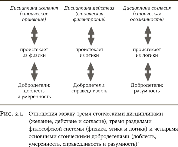 Эта диаграмма представляет собой фундаментальную схему стоической мысли и позволяет понять, что же такое стоицизм. Дисциплина желания (также называемая стоическим принятием) указывает, что нам надлежит и не надлежит хотеть. Это, в свою очередь, проистекает из того факта, что одни вещи находятся в нашей власти, тогда как другие нет. Однако мы можем отличить одно от другого, только понимая, как устроен мир. Ведь люди, не обученные физике, склонны ошибочно полагать, будто контролируют больше, чем на самом деле (принимают желаемое за действительное). За управление желаниями отвечают две из четырех стоических добродетелей: доблесть (умение смотреть в лицо фактам и действовать соответственно) и умеренность (умение обуздывать свои желания и соизмерять их с тем, что достижимо). Дисциплина действия (также известная как стоическая филантропия, в смысле заботы о других) регулирует наше поведение в мире. Дисциплина действия – результат надлежащего понимания этики, размышлений над тем, какую жизнь мы ведем. Она опирается на добродетель справедливости. Наконец, дисциплина согласия (или стоическая осознанность) указывает, как реагировать на различные ситуации, когда мы либо соглашаемся с нашими первоначальными впечатлениями о данной ситуации, либо опровергаем их. Эта дисциплина основана на изучении логики – как надлежит и не надлежит мыслить – и требует такой добродетели, как разумность.