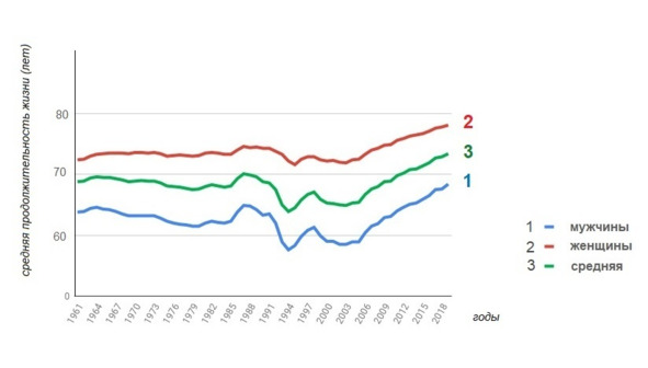 Она наметилась в 1986: на графике виден подъём кривой (учёные объясняют это действием «сухого закона», но есть и причина психологическая: это было начало перестройки, время больших надежд). Затем наступил 1991 – кривая резко поползла вниз. И только в 2005 начался её плавный подъём и мы включились, пусть и с опозданием, в общемировой процесс. Тенденция продолжается: с каждым годом средняя продолжительность жизни в России увеличивается.