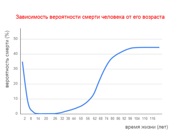 На графике показана зависимость вероятности смерти человека от его возраста: