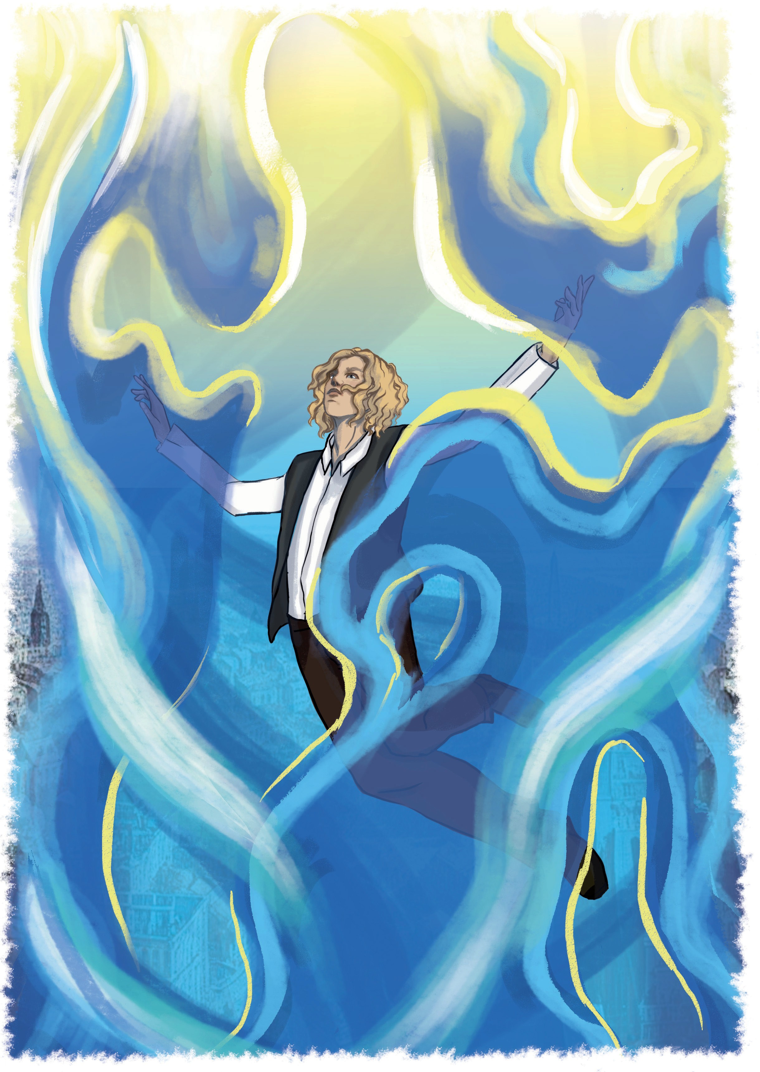 Петя стоял в холле издательского дома. По стенам заскользили золотисторозовые блики, чтото мелодично зазвенело, будто жемчужина упала в хрустальный бокал. Потом пространство искривилось: сначала завибрировали и зашатались стены, их очертания размылись. Вскоре они и вовсе исчезли. Окна сжались, мебель в вестибюле расплылась и утекла. Дружелюбный вахтёр плавно растворился в воздухе. Последним испарился лифт, оставив вместо себя чёрную точку. Повис протяжнонежный звук, допела задетая кемто струна. И всё исчезло… Остался только золотистоголубой свет. Петя словно повис в воздухе: в этом пространстве не было ни пола, ни стен.