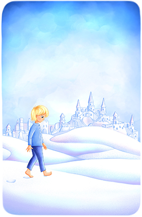 Необычайная радость охватила Петю! Засучив рукава пижамы, он с удивлением понял, что ему совсем не холодно. Паренёк шагал босыми ногами по прозрачной дорожке, не ведая, куда она его приведёт.