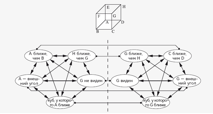 Бывает, что у сети ограничений могут быть взаимно противоречивые, но одинаково стабильные состояния. Это отражение такого явления, как противоречивость целого: целостный объект, но не его части, может быть интерпретирован двояко. Если пристально смотреть на рисунок куба на странице 123 (куб Неккера"), в какой-то момент ваше восприятие перевернется: вам начнет казаться, что вы видите не верхнюю его грань (вид снизу), а нижнюю грань (вид сверху). Когда происходит целостный переворот, изменение затрагивает интерпретацию каждой из частей объекта. Каждая ближняя к нам грань становится дальней гранью, каждый внутренний угол становится внешним углом, и так далее. И наоборот: если вы намеренно постараетесь увидеть внешний угол как внутренний, то можно произвольно вызвать обратный переворот всего куба. Динамика этого отражена в схеме под рисунком куба. Узлы представляют интерпретации элементов куба, и интерпретации, не противоречащие друг другу в структуре трехмерного объекта, возбуждают друг друга, в то время как противоречивые интерпретации тормозят друг друга.
