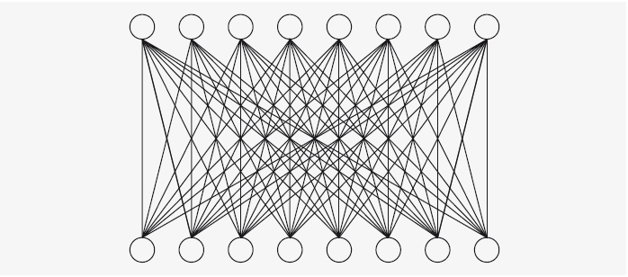 Мы же можем экспериментировать еще больше, вдохновляясь тем фактом, что в случае нейронов, в отличие от кремниевых процессоров, связи обходятся дешево. Почему бы не соединить каждый узел с другим узлом? Такая сеть сможет воплощать не только знание о том, что зеленый цвет означает «овощность», а хрусткость подразумевает «овощность», но и что зеленый цвет подразумевает хрусткость, хрусткость означает наличие листьев, наличие листьев означает отсутствие мобильности, и так далее: