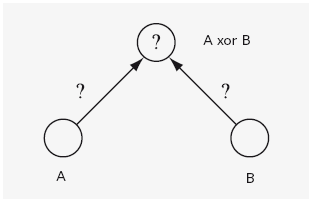 Ассоциатор паттернов, оснащенный таким методом обучения, называется персептроном. Персептроны интересны, однако у них есть один большой недостаток. Они напоминают плохого повара, который считает, что если каждый ингредиент в небольшом количестве хорош, то все ингредиенты сразу и помногу – это будет еще лучше. Решая, правомерно ли определенный набор сигнальных входов приводит к выключению выходного сигнала, персептрон взвешивает их и складывает. Это зачастую дает неверный ответ, причем даже к простой задаче. Хрестоматийный пример этого недостатка – это то, как персептрон справляется с простой логической операцией, называемой «исключающее ИЛИ», что означает «А или В, но не оба сразу».