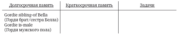 Новые записи в колонке «Задачи» побуждают к действию других демонов. Один из них (на концептуальном уровне) ищет родителей системы, копируя (на механическом уровне) все записи, содержащие имена родителей, в раздел «Краткосрочная память» (если только там уже нет таких записей, конечно; это условие необходимо, чтобы демон не продолжал бессмысленно делать одну копию за другой, как ученик чародея):