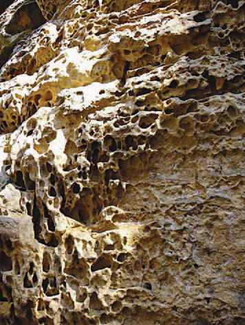 Eine der typischen Verwitterungsform im Sandstein sind die Waben. Ihre Entstehung geschieht vorwiegend durch chemische Kräfte und nicht, wie man früher annahm, durch Winderosion. Salze werden an der Gesteinsoberfläche ausgeschieden. Dabei bilden sich Kristalle, die den Sandstein sprengen und damit die Verwitterung beschleunigen. Gleichzeitig kommt es unter dem Einfluss von Kieselsäure zu einer Verfestigung des Felsens. Diese beiden entgegengesetzten, in enger Nachbarschaft ablaufenden Vorgänge führen zu der charakteristischen Wabenstruktur.