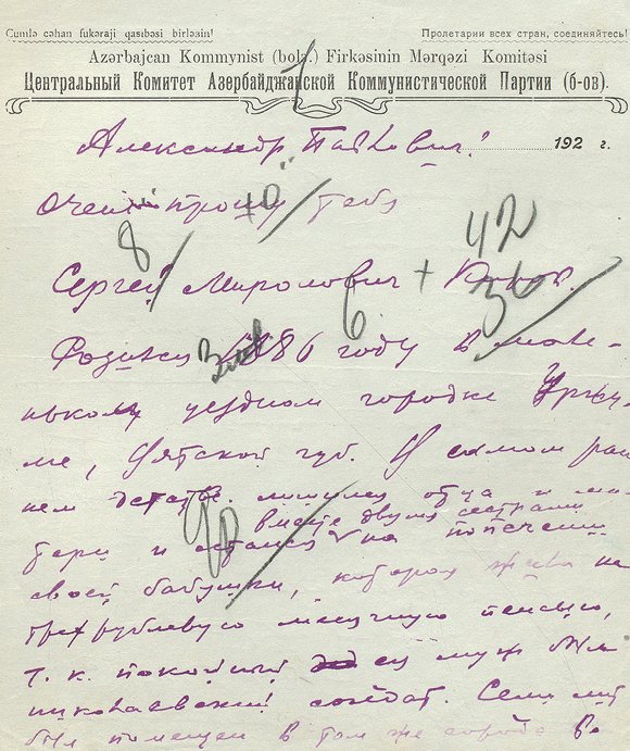 Так начал свою автобиографию наш герой, когда ему пришлось взяться за перо, чтобы кратко изложить собственное прошлое. Дело происходило в Баку, и, похоже, он очень торопился исполнить задание, явно не из приятных для него, если писал на том, что подвернулось под руку, – на служебных бланках ЦК Азербайджанской компартии, в том числе и на одном использованном ранее. На нём под самой «шапкой» тем же почерком выведено: «Александр Павлович! Очень прошу тебя…» Что хотел от главы «Азнефти» Серебровского товарищ Киров, осталось неизвестным. Ниже той же скорописью начертаны уже процитированные первые строчки автобиографии…
