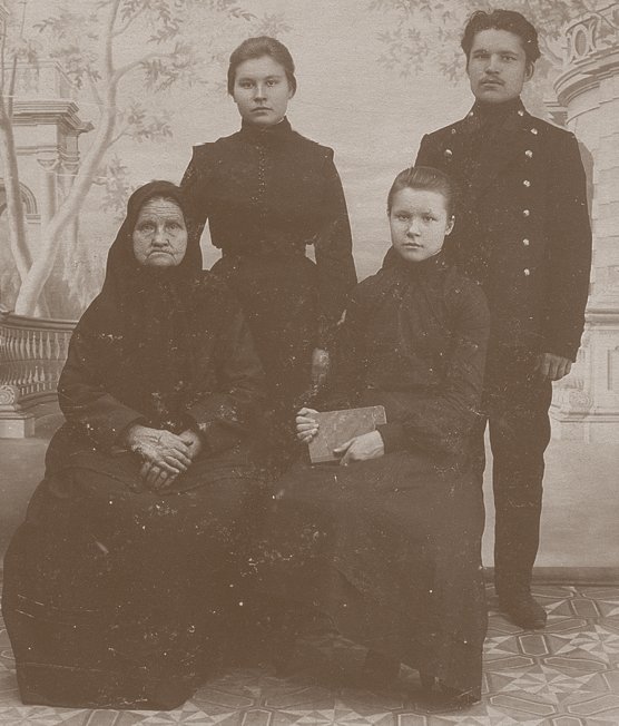 Сергей Костриков с бабушкой Меланьей Авдеевной и сестрами Анной и Елизаветой, 1904 г. [РГАСПИ]