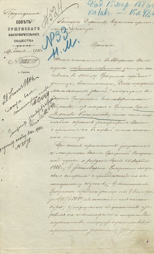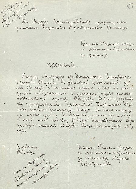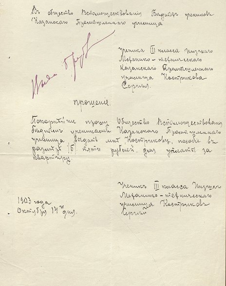 Прошение о зачислении Сергея Кострикова в Казанское промышленное училище, 1901 г. [РГАСПИ]