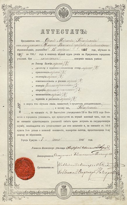 Аттестаты Сергея Кострикова об окончании Уржумского городского училища и Казанского промышленного училища, 1901 и 1904 гг. [РГАСПИ]