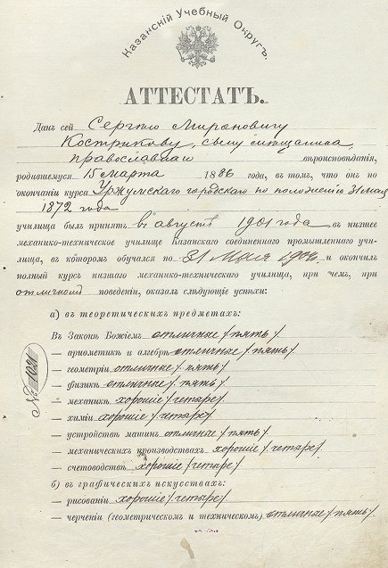 Костриков распростился с учебой в Казани 1 июня 1904 года. Ему вернули выписку из метрики с датой рождения и удостоверение о принадлежности к мещанскому сословию. Вручили аттестат, который, в отличие от аналога училища уржумского, свидетельствовал об успехах выпускника: одни «отличные» и «хорошие» оценки. Ни единой «достаточно», то есть «тройки». «В теоретических предметах» им освоено на «пять» «устройство машин», а в «графических искусствах» – геометрическое и техническое черчение. «По практическим работам в механических мастерских» как столяр он заслужил твердое «четыре», а как слесарь и механик – уверенное «пять»[23].