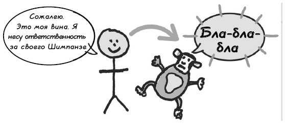 Помните: вы не должны использовать Шимпанзе в качестве оправдания. Если у вас есть собака и она кого-то покусала, вы не можете просто сказать: «Извините, но это ведь был не я, а моя собака». Вы отвечаете за собаку и ее действия. Аналогично вы полностью отвечаете за своего Шимпанзе и его действия. Таким образом, никаких оправданий! Вы даже не можете парировать так: «О да, я сказал и сделал некоторые ужасные вещи, поскольку это действовал мой Шимпанзе, поэтому не надо меня обвинять». Именно вы несете ответственность за управление своим Шимпанзе. Вы можете научиться управлять Шимпанзе и прекратить делать вещи, которые вынуждают вас страдать и приносят боль другим. Научиться совладать с Шимпанзе – это навык, требующий времени. И вам может понадобиться помощь, чтобы справиться со своими эмоциями и импульсами.