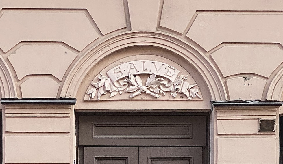 Проследуем до канала Грибоедова без остановки, мимолетно отметив на ходу изящный полукруглый эркер-фонарик с ажурным балкончиком в центре фасада дома 8 и латинским «salve» (здравствуй) над входом.