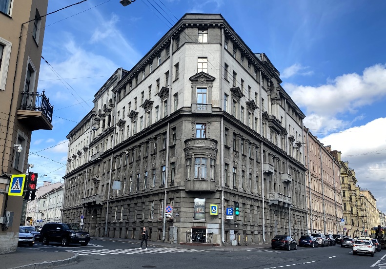 Это бывший доходный дом братьев Марголиных, построенный в 1914 году по проекту Александра Львовича Лишневского – одного из лучших петербургских архитекторов начала XX века. Лишневский работал сначала в стиле модерн, а в начале 1910-х годов построил и несколько зданий в духе неоклассики, в том числе и этот добротный дом с благородными фасадами. Глубокие лоджии верхних этажей создают образ ренессансного дворца. В декоре использованы, как всегда у Лишневского, довольно странные образы. Так, например, в сандриках окон четвертого этажа помещена разверстая пасть какого-то мифического зверя, «вырастающего» из морской раковины.