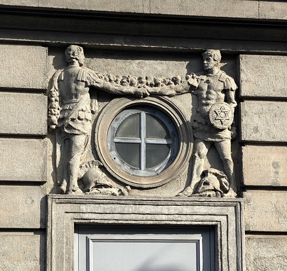 Один из входных порталов со стороны Большой Подьяческой украшает горельеф: двое мужчин в римских доспехах пожимают друг другу руки. На щите одного из воинов изображена шестиконечная звезда Давида, что указывает на иудейское вероисповедание владельцев дома, которые здесь же и поселились со своими семьями.